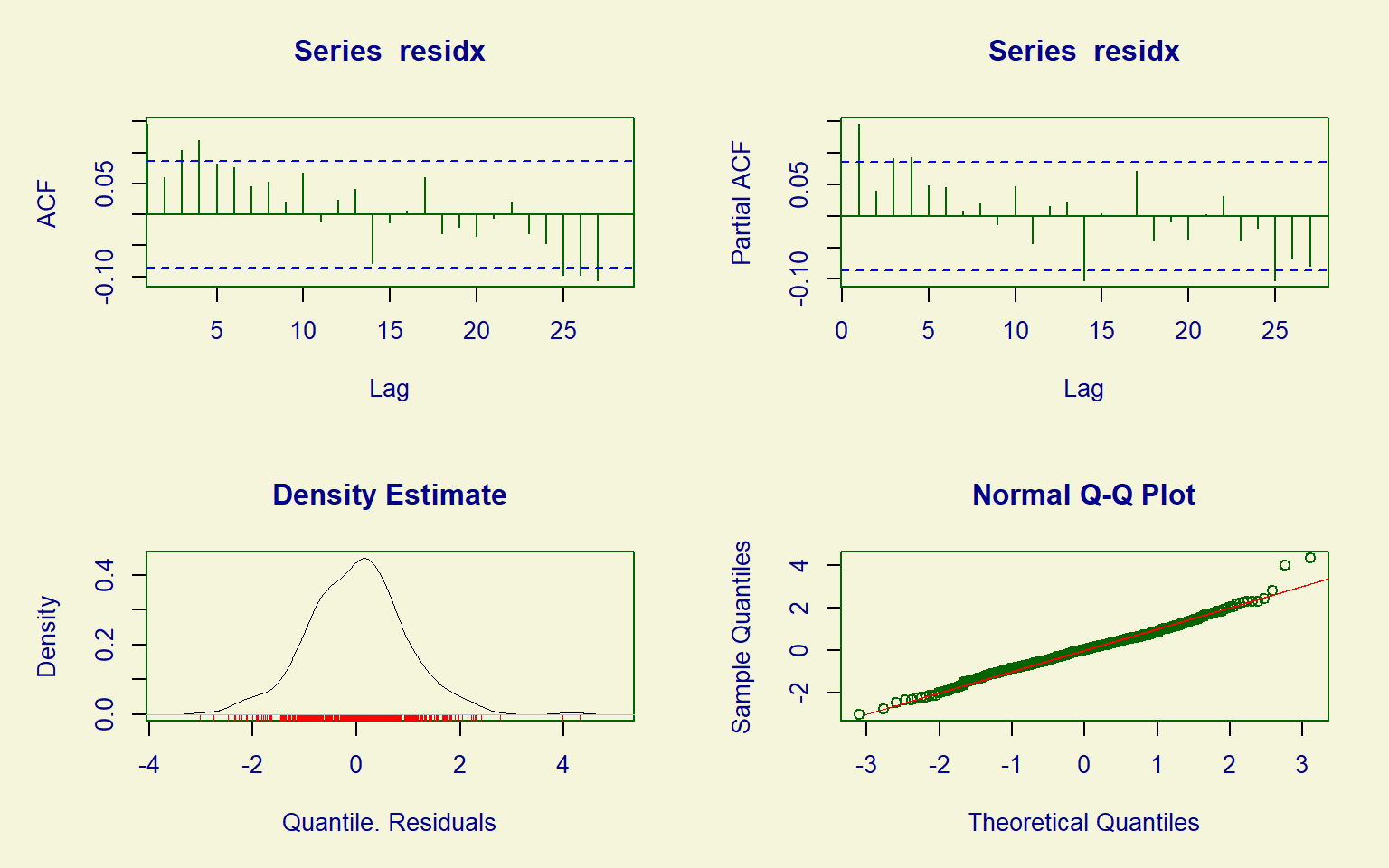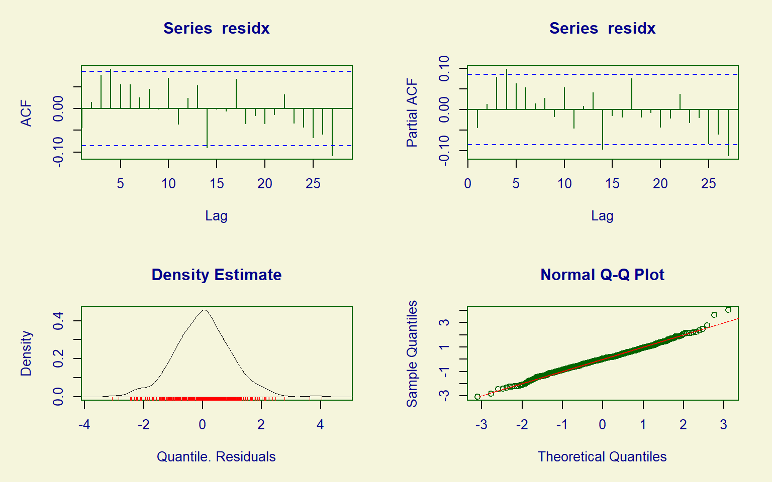 Other applicable models include models with mixed effects such as for repeated measures ANOVA (e.g., implemented in R using nlme::gls() and nlme::lme(), see different correlation structures; without a grouping factor, the results of nlme::lme(..., correlation = corARMA(...)) should be similar to estimating model in Equation 9.10). Other regression functions often borrow the functionality (and syntax) of the package nlme for estimating random effects, so autocorrelated residuals can be incorporated into a generalized additive model, GAM, mgcv::gamm(); generalized additive model for location scale and shape, GAMLSS, gamlss::gamlss(), which also can be used just as GAM, if scale and shape parameters are not modeled. A slightly different solution is possible using a generalized autoregressive moving average model (GARMA) demonstrated in Appendix D, see gamlss.util::garmaFit().