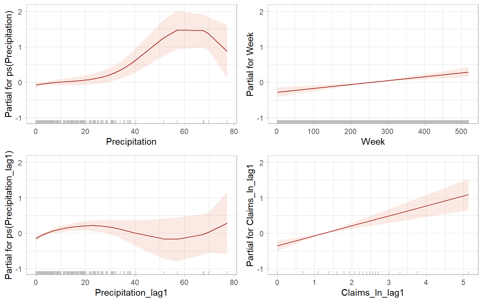 Stasinopoulos and Rigby (2007) provide an extension of a generalized additive model to \(k=1,2,3,4\) parameters \(\boldsymbol{\theta}_k\) of a distribution in a so-called generalized additive model for location scale and shape (GAMLSS). The \(k\) parameters represent the location parameter \(\mu\) (it is what we typically model with regression models), scale \(\sigma\), and two shape parameters: skewness and kurtosis. The model can be further generalized for \(k>4\) if needed. It allows us to fit \(k\) individual models to study relationships between regressors \(\boldsymbol{x}\) and parameters of the response distribution: \[ g_k(\boldsymbol{\theta}_k) = h_k\left(\boldsymbol{X}_k,\boldsymbol{\beta}_k\right) + \sum_{j=1}^{J_k}h_{jk}(\boldsymbol{x}_{jk}), \tag{9.12}\] where \(k=1\) produces model for the mean; \(h_k(\cdot)\) and \(h_{jk}(\cdot)\) are nonlinear functions; \(\boldsymbol{\beta}_k\) is a parameter vector of length \(J_k\); \(\boldsymbol{X}_k\) is an \(n\times J_k\) design matrix; \(\boldsymbol{x}_{jk}\) are vectors of length \(n\). The terms in the GAMLSS provide a flexible framework to specify nonlinearities, random effects, and correlation structure as in the mixed effects models (Zuur et al. 2009); see Table 3 by Stasinopoulos and Rigby (2007) for the possible specifications of the additive terms. Hence, a model as in Equation 9.12 may accommodate non-normal distributions, possibly nonlinear relationships, and spatiotemporal dependencies in the data.